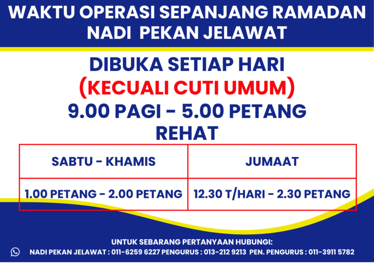 MAKLUMANNADI Pekan Jelawat tidak beroperasi pada 17 & 18 Februari 2026 (Selasa & Rabu) sempena cuti umum Tahun Baru Cina. Akan kembali BEROPERASI pada 19 Februari 2026 (Khamis).